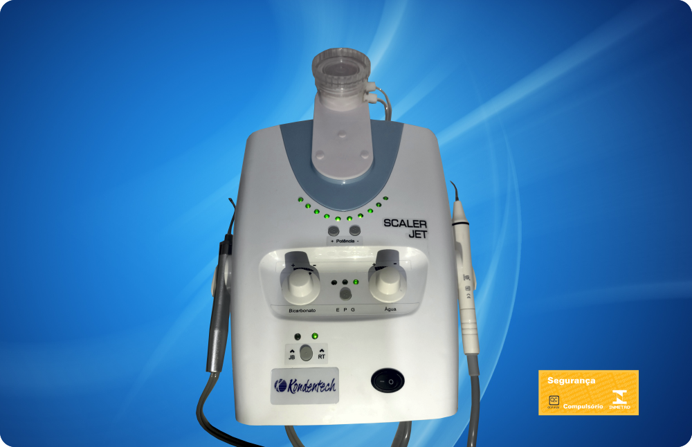 Moderno sistema digital para profilaxia dentária de última geração para uso odontológico. Jato de Bicarbonato: filtro de ar com drenagem automática. Reservatório de Bicarbonato de Sódio removível e transparente. Controle independente de fluxos de água e pó. Sistema de limpeza dos condutores de pó. Ultrassom: sistema piezoelétrico. Digital. Reservatório para líquidos com bomba interna. Peça de mão com iluminação LED removível e autoclavável. Acessório opcional: capa removível e autoclavável. Bivolt.