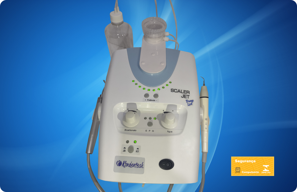 Moderno sistema digital para profilaxia dentária de última geração para uso odontológico. Jato de Bicarbonato: filtro de ar com drenagem automática. Reservatório de Bicarbonato de Sódio removível e transparente. Controle independente de fluxos de água e pó. Sistema de limpeza dos condutores de pó. Ultrassom: sistema piezoelétrico. Digital. Peça de mão removível e autoclavável. Acessório opcional: capa removível e autoclavável. Bivolt.